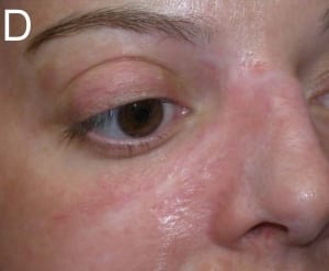 Figure 2. This patient’s laceration on the cheek was treated with two sessions of mulitpass, high-fluence, high-density CO2 laser skin resurfacing.
