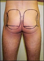 In the preoperative room, the outlines of the flexed and the relaxed gluteal areas are drawn with a marking pen with the patient in the standing position (Figure 1). The superior aspect of the augmentation is outlined as well as the more inferior aspect. These markings are made in front of a mirror so the patient can offer input.